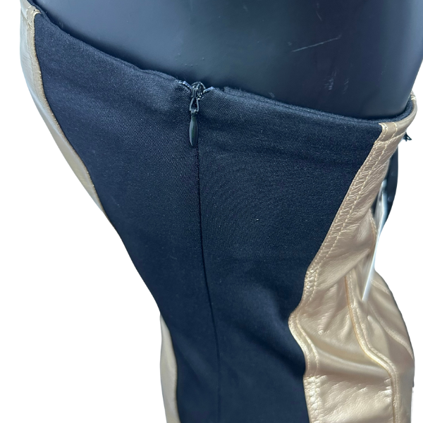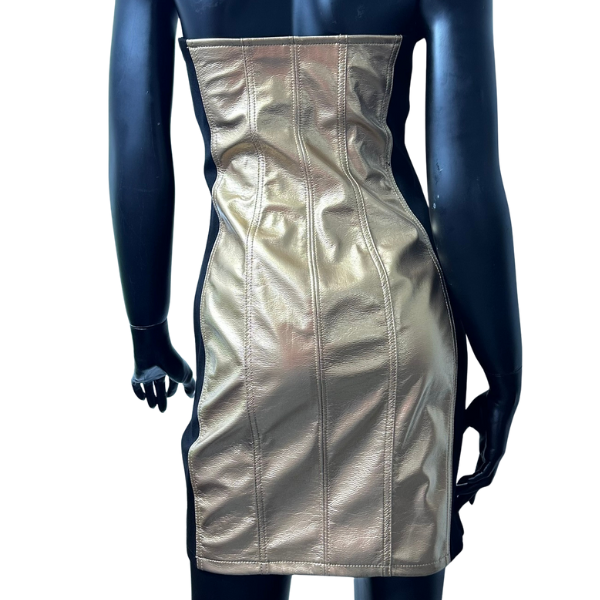 Елегантна къса рокля тип бюстие, изработена от висококачествена еко кожа със златист метализиран ефект. Декоративните шевове издължават силуета и подчертават извивките, а страничните еластични панели осигуряват комфорт и перфектно прилягане. Скритият страничен цип добавя удобство. Стилна, модерна и секси – тази рокля е идеален избор за вечерно излизане, коктейл или парти