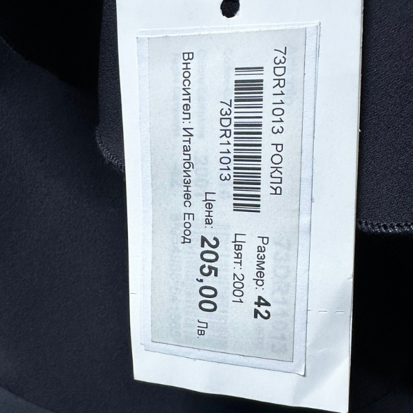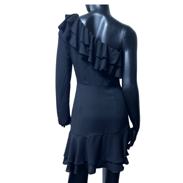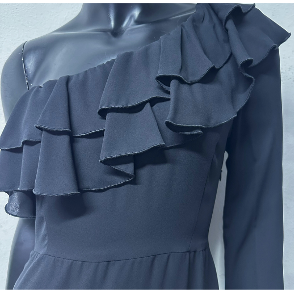 Роклята е елегантна, асиметрична, в класически черен цвят. Моделът е еднораменен – с дълъг ръкав от едната страна и ефектни къси волани, които падат по деколтето и рамото. Долната част също завършва с двоен волан, придавайки на роклята движение и женственост. Дължината е над коляното – стилна и подходяща за вечерни поводи. Материята е лека и пада свободно по тялото, подчертавайки силуета.