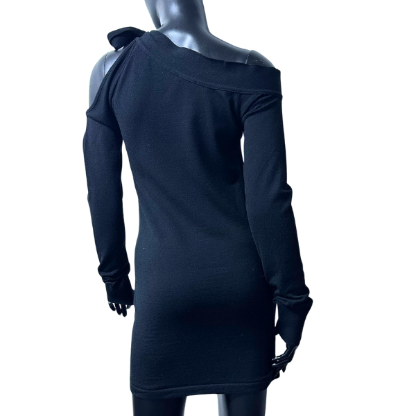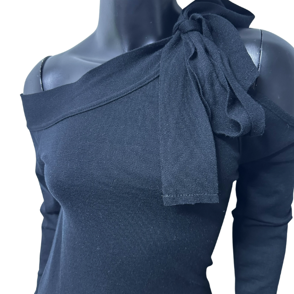 Моделът е с дълъг ръкав и ефектно паднало рамо, декорирано с нежна панделка за женствен акцент. Кройката е вталена, подчертаваща силуета, а дължината е над коляното – подходяща за вечерни събития или специални поводи