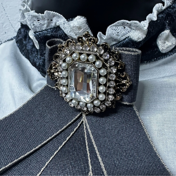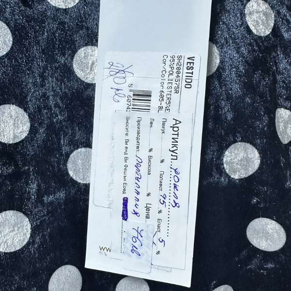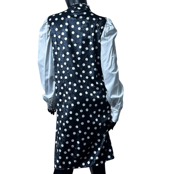 Рокля с уникален ретро чар, изработена от черен кадифен плат на бели точки, с фина подплата за комфорт и перфектен силует. Дължината е до коляното, а правата кройка я прави подходяща за различни поводи. Деколтето е допълнено с дантелен детайл и богата брошка с кристали ,която придава елегантност и изисканост. Дългите бели ръкави контрастират красиво с основата и добавят романтичен акцен. Има подплата към роклята.