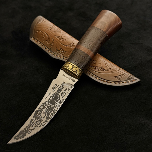 Руски ловен нож ОХОТНИК ВОЛК, стомана 65х13, кожена кания, дръжка орех и венге