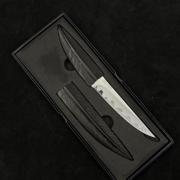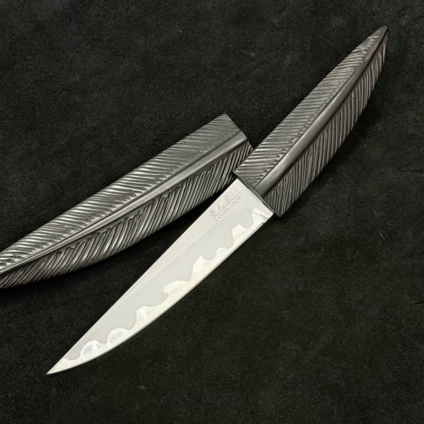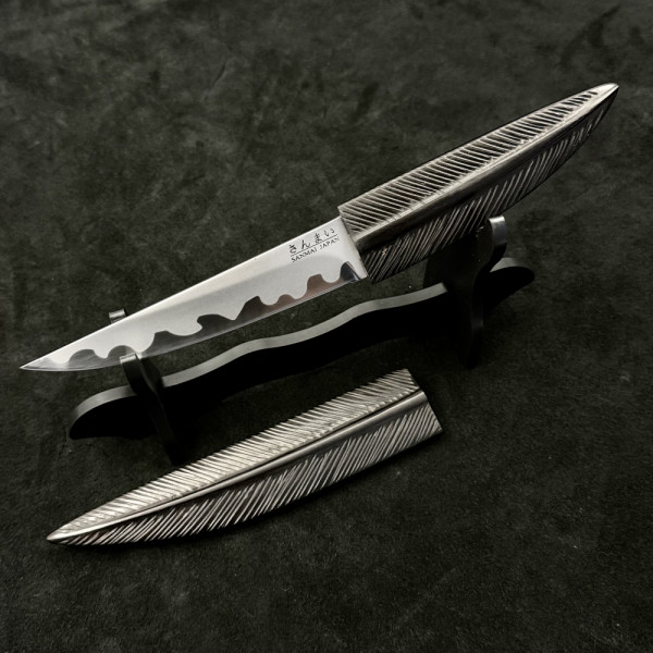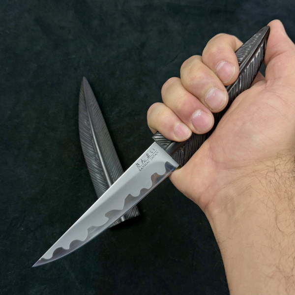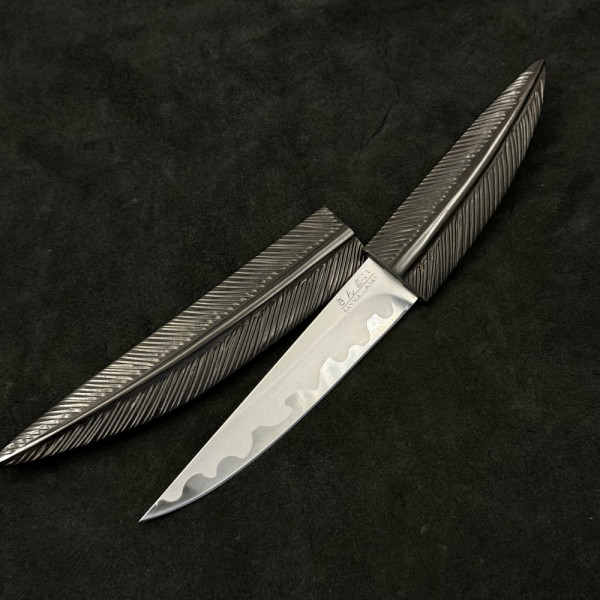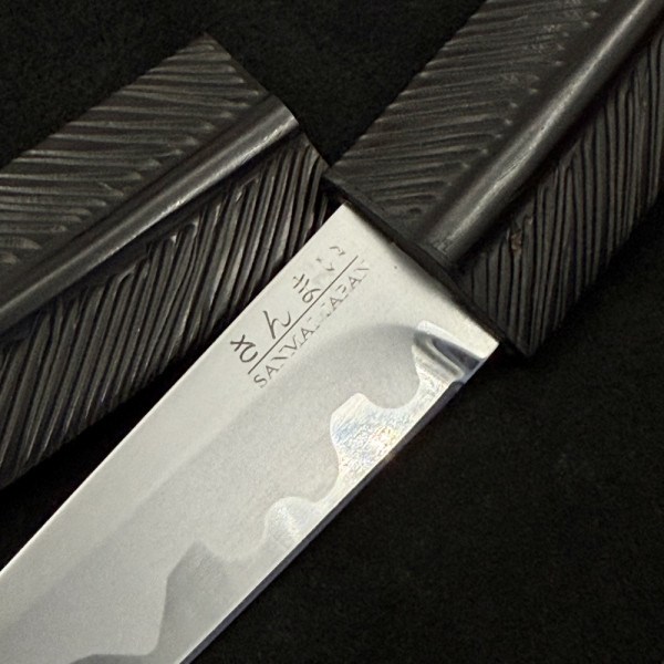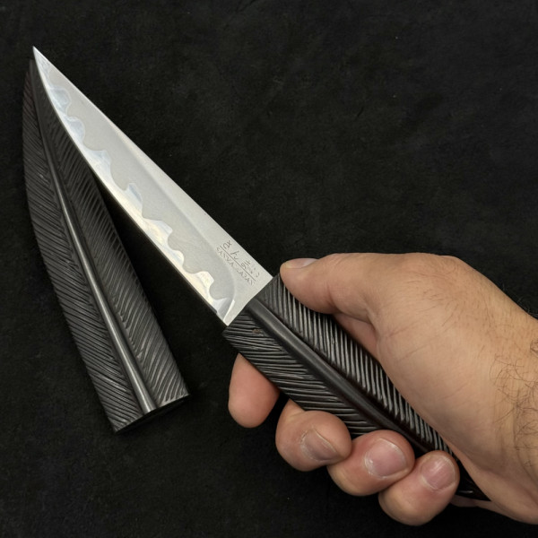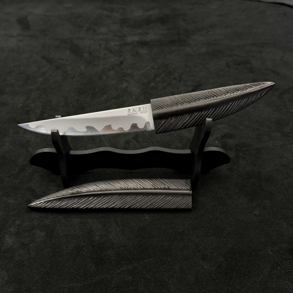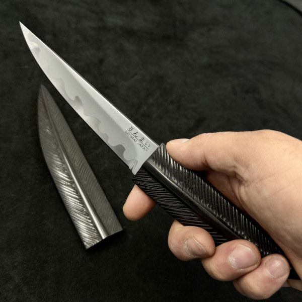 Занаятчийски японски нож с маркировка SENMAI JAPAN, съчетаващ традиционна ламинирана конструкция и изключителна острота. Карбоновото ядро осигурява чист и прецизен разрез, а естествената патина придава уникален характер с времето. Компактният размер го прави идеален за фина и детайлна работа в кухнята. Дръжката от естествено дърво и ръчно изработената дървена сая подчертават автентичния японски минимализъм. Подходящ за ценители, професионални готвачи и колекционери.