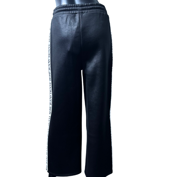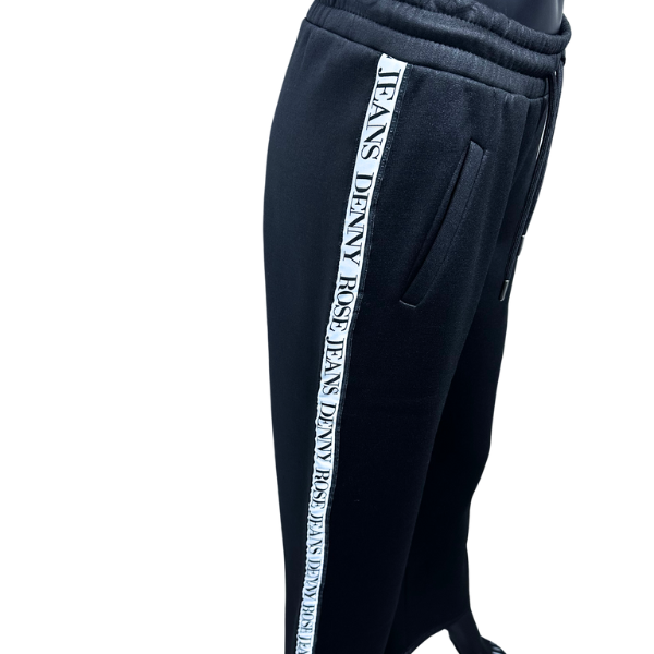 Моделът е с еластична талия и връзки за регулиране, широк крачол и странични джобове. Черният цвят е освежен с контрастни ленти с логото DENNY ROSE JEANS по дължината на крачола, което придава спортно-шик излъчване.
