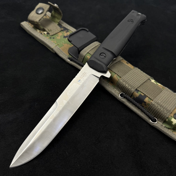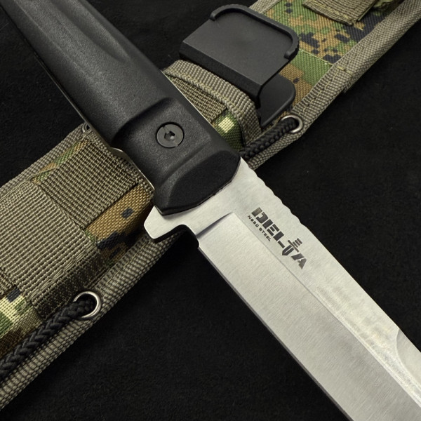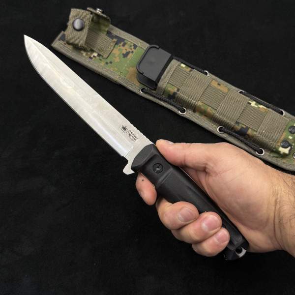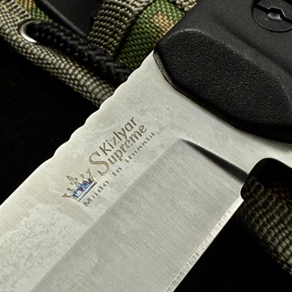 Тактическият супер нож за оцеляване и битка KIZLYAR SUPREME Aggressor е титанично оръжие в дивата природа и на бойното поле. Практически неразрушим, той ще ви служи вярно години наред. Изработен е перфектно от върха до края на дръжката от най-качествените материали. Острието е изковано от най-здравата стомана D2, която е издръжлива на износване и съчетава в себе си баланс между твърдост и гъвкавост. Високото съдържание на хром я прави неръждаема, а качествата на самата сплав й придават устойчивост на механични удари. Това се допълва и от фултанг структурата - ножът е изработен от цяло парче стомана, което продължава и в дръжката до самия й край. До острието има малък предпазител за безопасност на пръстите. Дръжката е от няколко слоя специален подсилен полимер, който гарантира дълга употреба и то при тежки атмосферни условия и механични удари. Сигурен захват, без значение дали ръцете ви са мръсни с кал, кръв, мазнина или вода.