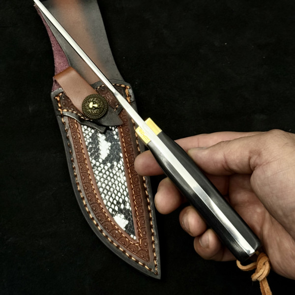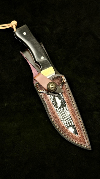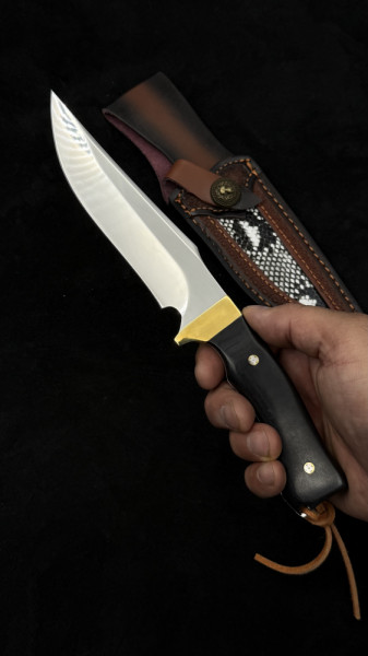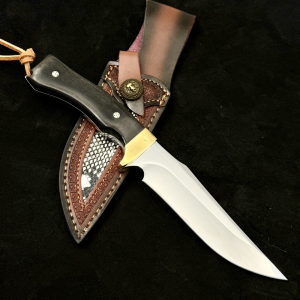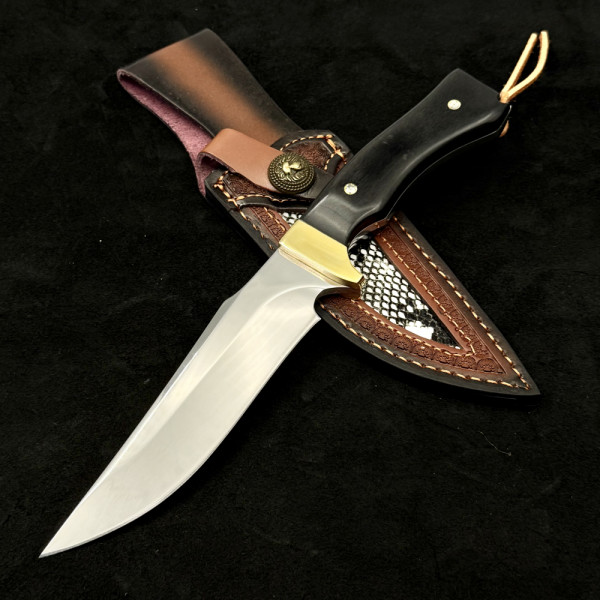 Масивен, здрав и много красив немски ловен нож Der HUNT 256, огледално полирано много остро острие, фултанг. Гравирана ръчно шита кания от телешка кожа