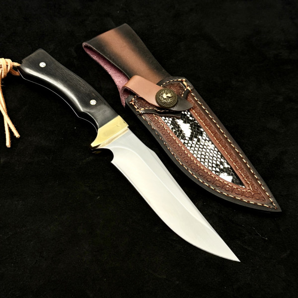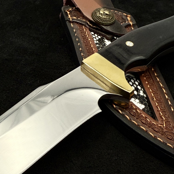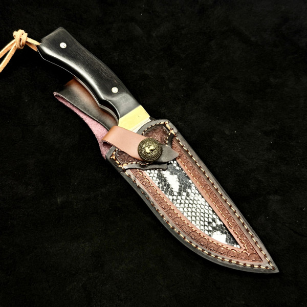 Тежък ловен нож Der HUNT 256, фултанг, стомана 7Cr13mov , дръжка махагон, гард месинг, гравирана кожена кания