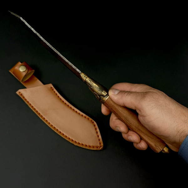 Красив, удобен и функционален ятаганен нож за разфасоване, обковано острие от 5Cr13Mov ванадиева стомана, дурвена дръжка и месингов гард