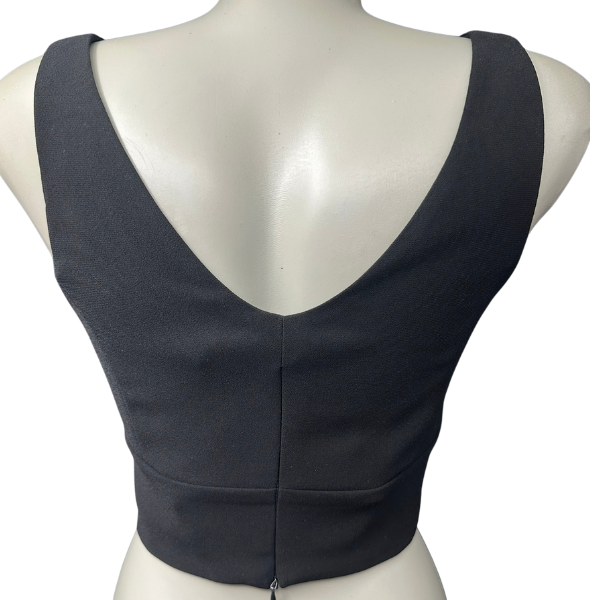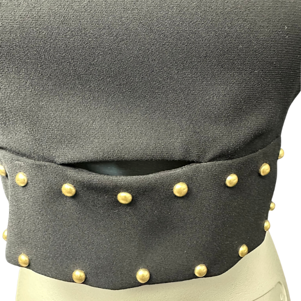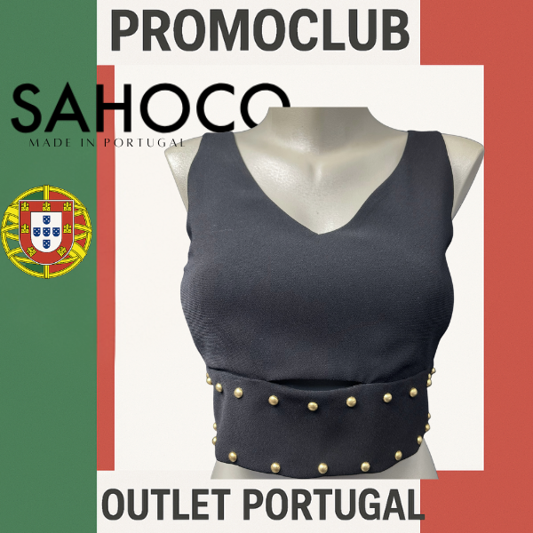 Елегантен черен топ с V-деколте и златни капси по талията. Уникален дизайн от португалската марка SAHOCO. Моделът подчертава фигурата и е подходящ за вечерни визии или специални поводи.