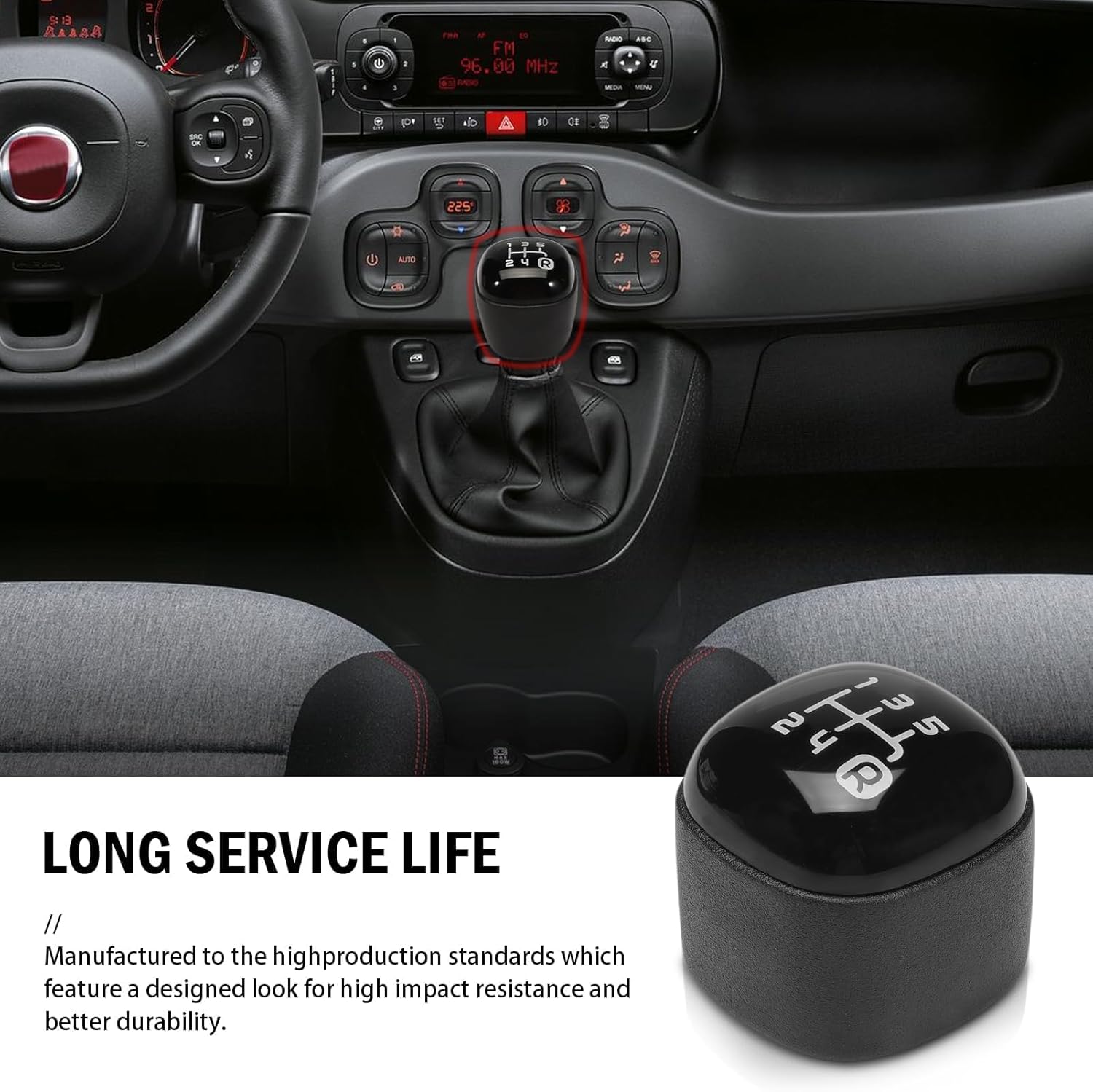 Топка за скоростен лост, предназначена за автомобили Fiat Panda с 5-степенна ръчна скоростна кутия. Продуктът е изработен от висококачествена ABS пластмаса и еко кожа, които осигуряват устойчивост на износване, здравина и комфортен захват при превключване на предавките.