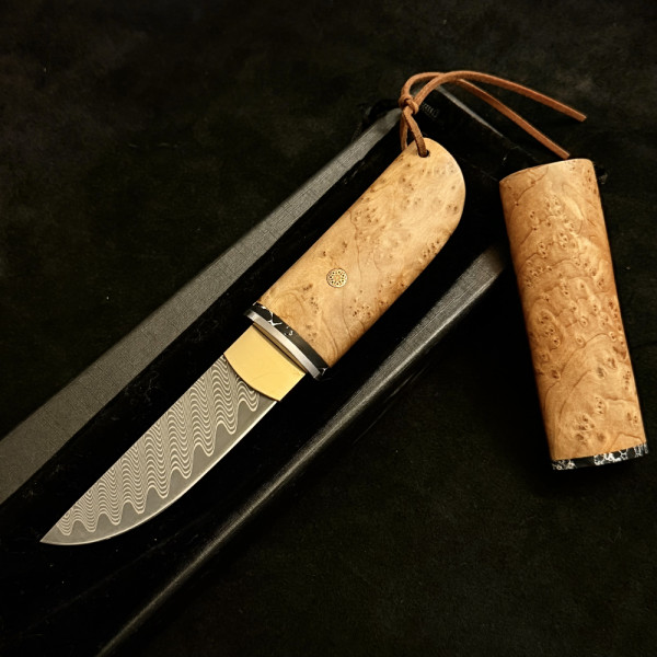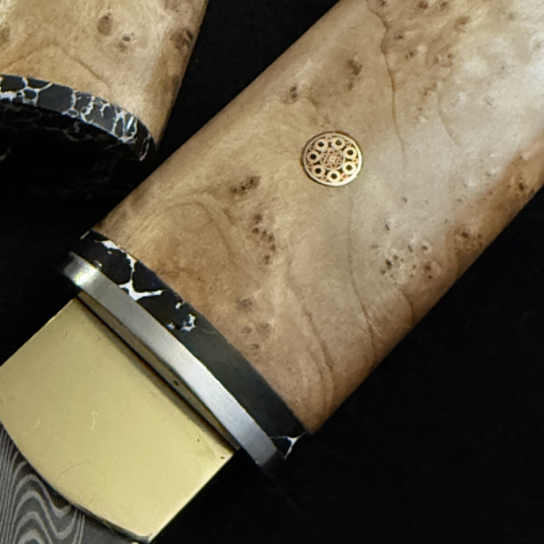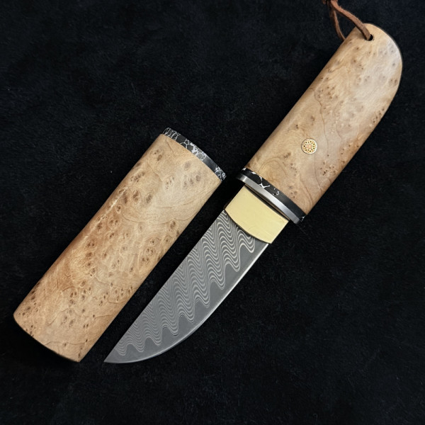 Компактен японски работен нож с фиксирано острие от дамаска стомана, дръжка и кания от едно цяло парче дърво- креалска бреза. Държиш история и традиция в ръцете си