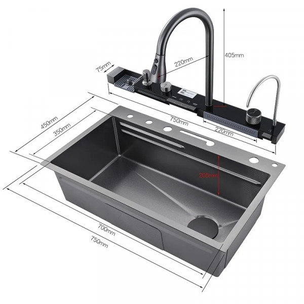 Висок клас интегриран умивалник C-052- стомана с нано покритие, месинг и инокс с подвижен чучур, дигитален термостат с дисплей и всички екстри