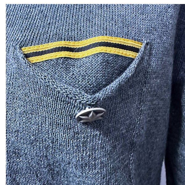 Жилетката разполага с джоб с декоративна лента в жълто и черно, завършен със стилна метална емблема със звезда. Класическата кройка с V-образно деколте и ластични маншети гарантира перфектно прилягане и удобство.
